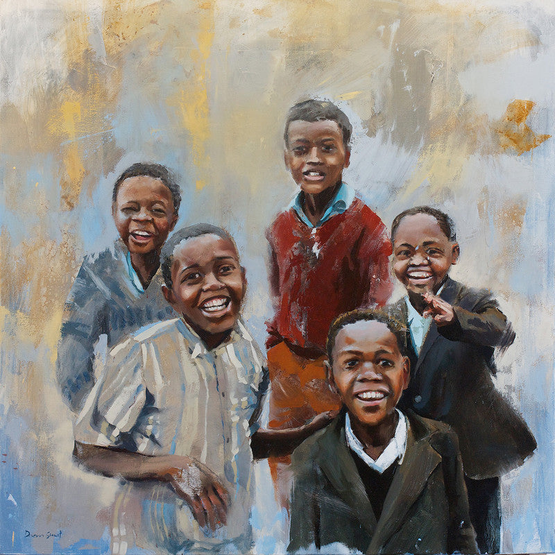 An art print of an artwork by Duncan Stewart, showing a group of school kids waiting for the school bus.