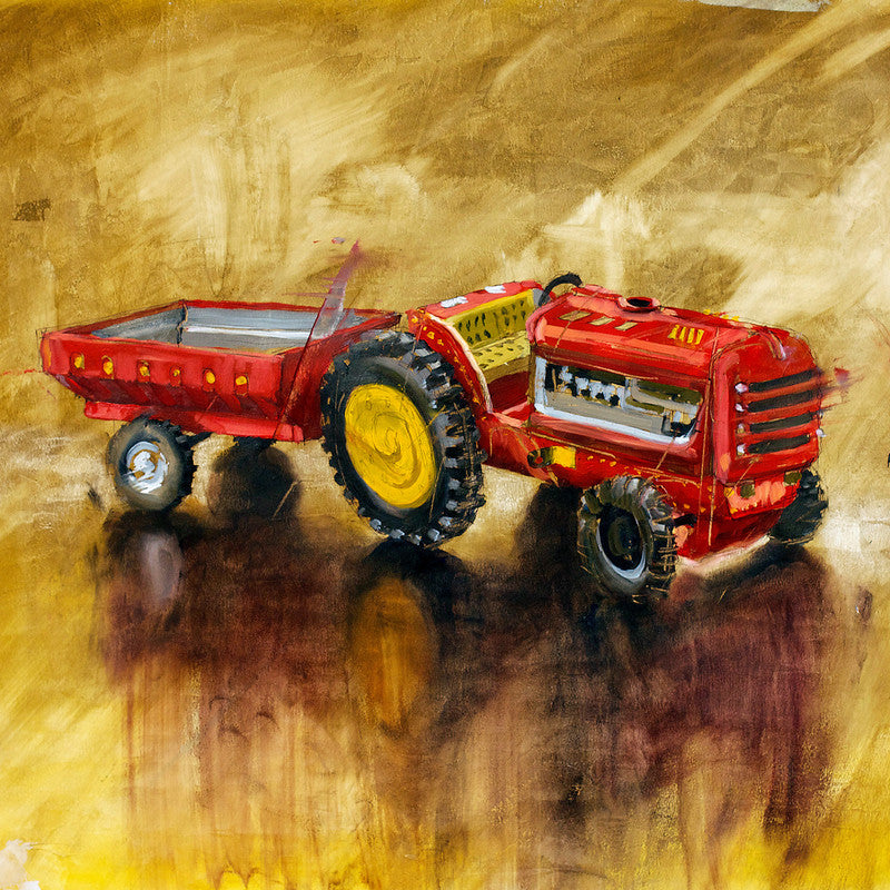 A print of an artwork by Duncan Stewart depicting a kid's toy tractor with a trailer, highlighting its playful and nostalgic qualities with artistic textures and detail.